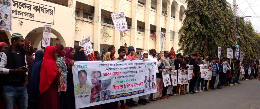 গোপালগঞ্জ জেলা শহরের নতুন বাজার রোডে প্রতিপক্ষের হামলায় নিহত হাবিব মোল্লার হত্যাকারীদের বিচারের দাবীতে বিক্ষোভ মিছিল, সমাবেশ ও মানববন্ধন কর্মসূচী পালন করা হয়েছে। বুধবার (১৮ জানুয়ারী) সকালে নিহতের স্বজন ও এলাকাবাসী এ কর্মসূচীর আয়োজন করে।জেলা প্রশাসকের কার্যালয়ের সামনে প্রায় ঘন্টাব্যাপী কয়েকশ” এলাকাবাসী এ কর্মসূচী পালন করে হাবিব মোল্লা হত্যাকারীদের দৃষ্টান্তমূলক শাস্তির দাবী জানায়। এসময় তারা বিভিন্ন শ্লোগান লেখা ব্যানার ও ফেস্টুন হাতে নিয়ে আন্দোলন করে।