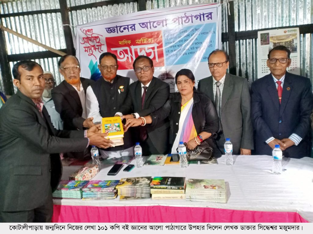 জন্মদিনে নিজের লেখা ১০১ কপি বই একটি পাঠাগারে উপহার দিলেন লেখক ডাক্তার সিদ্ধেশ্বর মজুমদার।বুধবার (০১ ফেব্রুয়ারী) সন্ধ্যায় গোপালগঞ্জের কোটালীপাড়া উপজেলার তারাশী গ্রামে জ্ঞানের আলো পাঠাগারে নিজের লেখা ২২টি বইয়ের ১০১ কপি উপহার দেন ডাক্তার সিদ্ধেশ^র মজুমদার।এ সময় প্রফেসর গৌরাঙ্গ লাল চৌধুরী, কার্তিক চন্দ্র বিশ্বাস, সাংবাদিক লেখক রবীন্দ্রনাথ অধিকারী, বীর মুক্তিযোদ্ধা আবুল কালাম দাড়িয়া, কবি মিন্টু রায়, কবি নিউটন বিশ্বাস, কবি সবিতা রায় প্রেরণা, কবি সুভাষ বালা, জ্ঞানের আলো পাঠাগারের সভাপতি সুশান্ত মন্ডল, সাধারণ সম্পাদক মাসুদুর রহমান পারভেজ উপস্থিত ছিলেন।লেখক ডাক্তার সিদ্ধেশ^র মজুমদার কোটালীপাড়া উপজেলার কলাবাড়ি ইউনিয়নের বরুয়া গ্রামের দেবন্দ্রনাথ মজুমদারের ছেলে ও মানিকগঞ্জের সাবেক সিভিল সার্জন।
