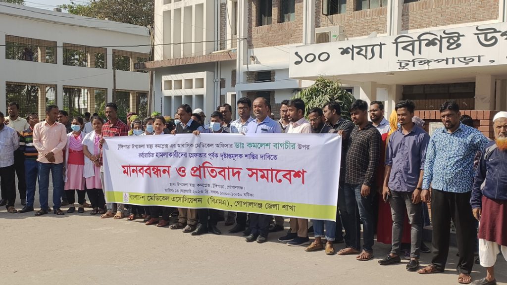 গোপালগঞ্জের টুঙ্গিপাড়ায় স্বাস্থ্য কমপ্লেক্সের আবাসিক চিকিৎসা কর্মকর্তা ডাঃ কমলেশ বাগচীর উপর হামলার প্রতিবাদে মানববন্ধন করেছে হাসপাতালে কর্মরত চিকিৎসকেরা।মঙ্গলবার (১৪ ফেব্রুয়ারি)সকাল ১০ টা থেকে সাড়ে ১০ টা পর্যন্ত বাংলাদেশ মেডিকেল এসোসিয়েশন (বিএমএ) গোপালগঞ্জ শাখার আয়োজনে টুঙ্গিপাড়া উপজেলা স্বাস্থ্য কমপ্লেক্সের সামনে এ মানববন্ধন কর্মসূচি অনুষ্ঠিত হয়।