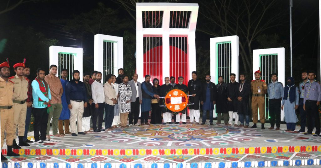 এর আগে ভাইস-চ্যান্সেলর প্রফেসর ড. এ. কিউ. এম. মাহবুবের নেতৃত্বে একুশের প্রথম প্রহরে রাত ১২টা ০১ মিনিটে ক্যাম্পাসের শহিদ মিনারে পুষ্পস্তবক অর্পণ করেন। এ সময় আরো শ্রদ্ধা নিবেদন করেন ট্রেজারার ড. মোঃ মোবারক হোসেন, শিক্ষক সমিতি, বঙ্গবন্ধু পরিষদ, বশেমুরবিপ্রবি ছাত্রলীগ, অফিসার্স এসোসিয়েশন, কর্মচারী সমিতি। সকাল পৌনে ৮টায় প্রশাসনিক ভবনের সামনে থেকে ভাইস-চ্যান্সেলর প্রফেসর ড. এ. কিউ. এম. মাহবুবের নেতৃত্বে প্রভাতফেরি ক্যাম্পাসের বিভিন্ন সড়ক প্রদক্ষিণ করে বিশ্ববিদ্যালয়ের শহিদ মিনারে গিয়ে শেষ হয় এবং সকাল ৮টায় সকল হল, বিভিন্ন বিভাগ এবং সামাজিক সাংস্কৃতিক সংগঠনসমূহ শহিদ মিনারে শ্রদ্ধা নিবেদন করেন।
