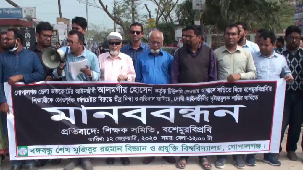 গোপালগঞ্জে আইনজীবী কর্তৃক এক বিশ্ববিদ্যালয়ের (বশেমুরবিপ্রবি) শিক্ষার্থীকে ধর্ষন চেষ্টার নিন্দা ও প্রতিবাদ জানিয়ে দোষী আইজীবীর দৃষ্টান্তমূলক শাস্তির দাবীতে মানববন্ধন করেছে বিশ্ববিদ্যালয়ের শিক্ষক-শির্ক্ষার্থী ও কর্মকর্তা-কর্মচারীরা।