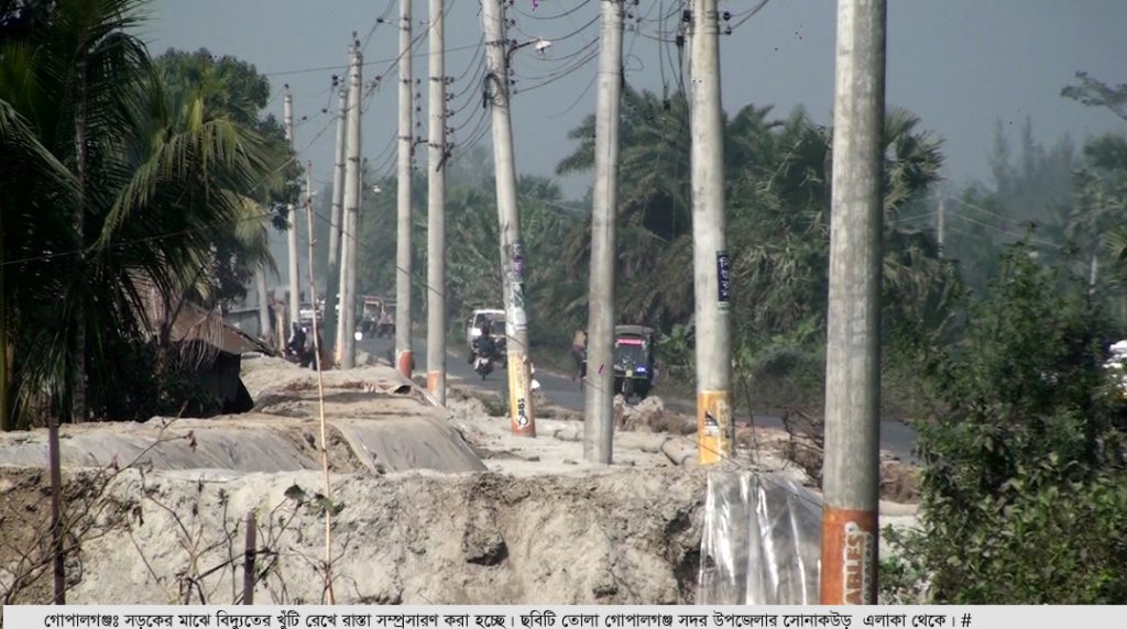 সড়ক ও বিদ্যুৎ বিভাগের সমন্বয়হীনতায় গোপালগঞ্জে আঞ্চলিক সড়কের মাঝে থাকা বৈদ্যুতিক খুঁটি অপসারণ না করেই রাস্তা নির্মাণ করে চলছে ঠিকাদারী প্রতিষ্ঠান। রাস্তার মাঝখানে খুঁটি রেখে সড়ক প্রশস্ত ও উন্নতিকরনে কাজের মান নিয়েও সংশয় দেখা দিয়েছে জনমনে। গোপালগঞ্জ সড়ক ও জনপথ বিভাগ সড়কের নির্মাণ কাজ বাস্তবায়ন করলেও বিদ্যুৎ বিভাগ খুঁটি সরানোতে উদাসিনতা দেখাচ্ছে বলে সড়ক বিভাগ দাবী করছে। বিদ্যুৎ বিভাগ বলছে প্রয়োজনীয় অর্থ বরাদ্দ পেলেই খুঁটি উত্তোলন বা সরানোর কাজ শুরু করা হবে।ফলে নির্মাণাধীন সড়কের খুঁটি অপসারণ নিয়ে দুই বিভাগের মধ্যে চলছে রশি টানাটানি।