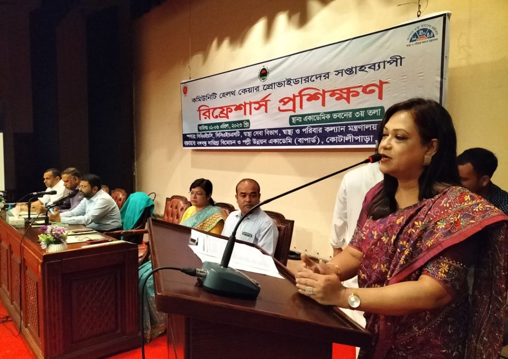 গোপালগঞ্জে ৮ জেলার কমিউনিটি ক্লিনিকের কমিউনিটি হেলথ কেয়ার প্রভাইডারদের (সিএইচসিপি) সপ্তাহব্যাপী রিফ্রেশার্স প্রশিক্ষণ শুরু হয়েছে।স্বাস্থ্য ও পরিবার কল্যাণ মন্ত্রণালয়ের স্বাস্থ্য সেবা বিভাগের সিবিএইচসি, সিসিএইচএসটি’র স্পন্সারে গোপালগঞ্জের কোটালীপাড়া বঙ্গবন্ধু দারিদ্র বিমোচন ও পল্লী উন্নয়ন একাডেমী (বাপার্ড) এই প্রশিক্ষণের আয়োজন করেছে। শনিবার ( ১ এপ্রিল) সকালে কমিউনিটি ক্লিনিকের সুপারভিশন ও মনিটরিং এর দায়িত্ব প্রাপ্ত এবং গোপালগঞ্জ বঙ্গমাতা চক্ষু হাসপাতালের পরিচালক প্রফেসর ডা. নাহিদ ফেরদৌসী প্রধান অতিথি হিসেবে এই প্রশিক্ষণের উদ্বোধন করেন ।