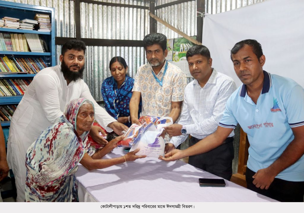 গোপালগঞ্জের কোটালীপাড়ায় জ্ঞানের আলো পাঠাগারের পক্ষ থেকে দরিদ্র ১০০ পরিবারের মাঝে ঈদসামগ্রী ও শাড়ি-লুঙ্গি বিতরণ করা হয়েছে।