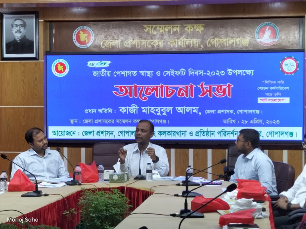 শুক্রবার (২৮ এপ্রিল) সকালে গোপালগঞ্জের জেলা প্রশাসকের সম্মেলন কক্ষে জেলা প্রশাসন এবং কারখানা ও প্রতিষ্ঠান পরিদর্শন অধিদপ্তর এ উপলক্ষে অলোচনা সভার আয়োজন করে।সভায় প্রধান অতিথির বক্তব্য দেন গোপালগঞ্জের অতিরিক্ত জেলা প্রশাসক ( শিক্ষা ও আইসিটি) মোঃ গোলাম কবির।কারখানা ও প্রতিষ্ঠান পরিদর্শন অধিদপ্তরের  গোপালগঞ্জ কার্যালয়ের উপ-মহা পরিদর্শক একেএম মানছুরুল হকের সভাপতিত্বে অনুষ্ঠিত আলোচনা সভায় সাংবাদিক ও উন্নয়নকর্মী মনোজ কুমার সাহা, শরীফ ফার্নিচারের সত্ত্বাধিকারী মোঃ কবির হোসেন, বাংলাদেশ প্রাইভেট হসপিটাল,ক্লিনিক এ্যান্ড ডায়গনস্টিক ওনার্স এ্যাসেসিয়েশনের সাংগঠনিক সম্পাদক মোঃ এনামুল হক মুনীর সহ আরো অনেকে বক্তব্য রাখেন।