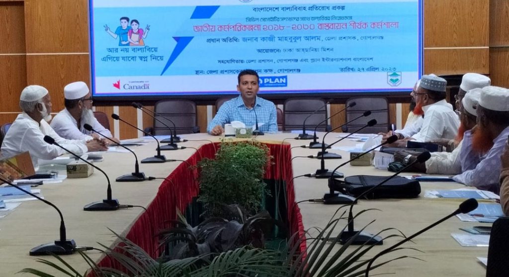 গোপালগঞ্জে সিভিল সোসাইটির সদস্যদের সাথে বাল্যবিবাহ নিরোধকল্পে জাতীয় কর্মপরিকল্পনা বাস্তবায়ণ শীর্ষক কর্মশালা অনুষ্ঠিত হয়েছে। প্লান ইন্টারন্যাশনাল বাংলাদেশের সহযোগীতায় ঢাকা আহছানিয়া মিশন এ কর্মশালার আয়োজন করে।