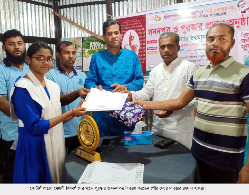 গোপালগঞ্জের কোটালীপাড়ায় জাতীয় গ্রন্থকেন্দ্র ও সংস্কৃতিক মন্ত্রণালয়ের আয়োজনে মুজিব শতবর্ষে শত গ্রন্থাগারে ‘পড়ি বঙ্গবন্ধুর বই, সোনার মানুষ হই’ শীর্ষক পাঠচক্রে অংশগ্রহণ করে বিজয়ী ১২জন মেধাবী শিক্ষার্থীর মাঝে পুরস্কার ও সনদপত্র বিতরণ করা হয়েছে।রবিবার (১৬ এপ্রিল) উপজেলার তারাশী বাসস্ট্যান্ডে নির্মিত জ্ঞানের আলো পাঠাগারে বসে এ পুরস্কার ও সনদপত্র বিতরণ করা হয়।পৌর মেয়র মতিয়ার রহমান হাজরা প্রধান অতিথি হিসেবে উপস্থিত থেকে এ পুরস্কার ও সনদপত্র বিতরণ করেন।