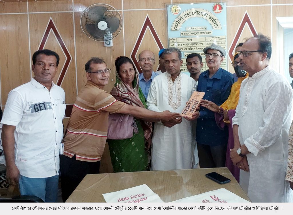 এদিকে মঙ্গলবার (১১ এপ্রিল) ভবিষ্যৎ চৌধুরীর ও দিগি¦জয় চৌধুরী কোটালীপাড়া পৌরসভার মেয়র মতিয়ার রহমান হাজরার কার্যালয়ে বসে মোহনী চৌধুরীর ১১০টি গান নিয়ে লেখা ‘মোহিনীর গানের মেলা’ বইটি কোটালীপাড়া উপজেলার বিভিন্ন গন্যমাণ্য ব্যক্তিদের হাতে তুলে দেন।