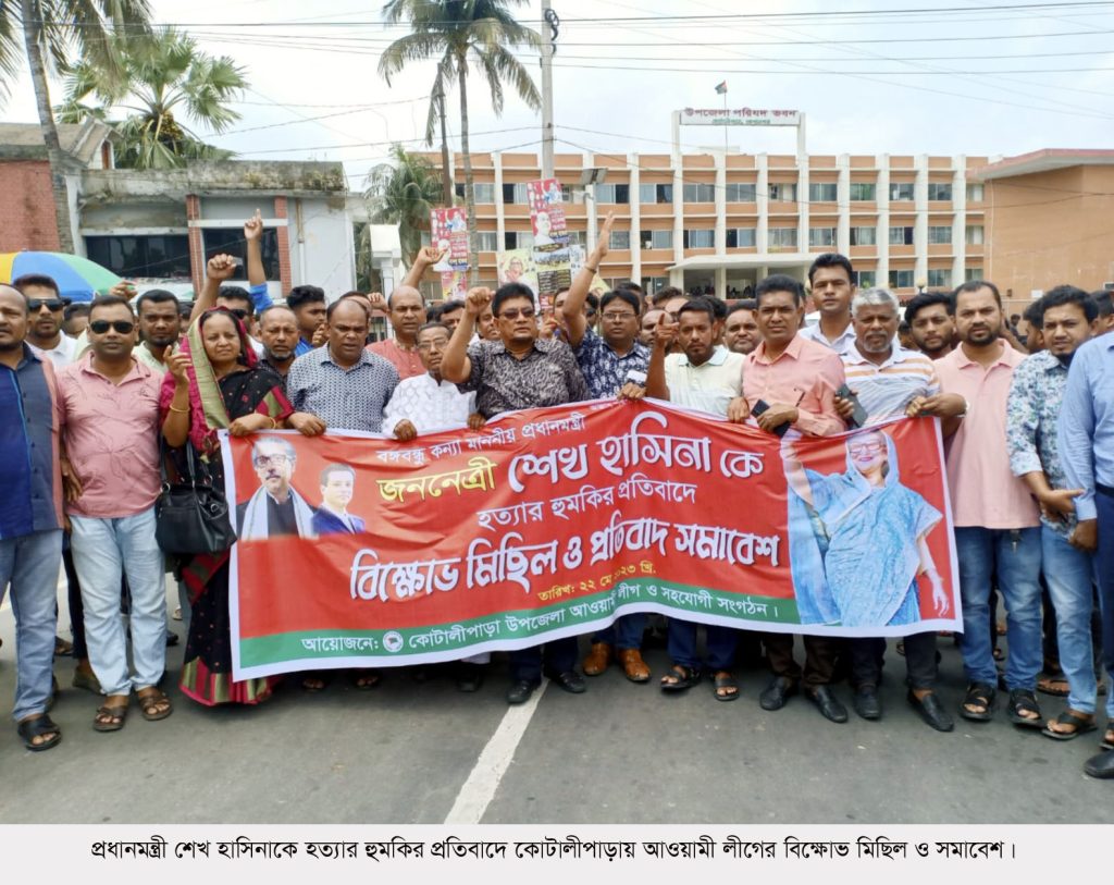 রাজশাহী জেলা বিএনপির আহবায়ক আবু সাইদ চাঁদ কর্তৃক প্রকাশ্য জনসভায় আওয়ামী লীগ সভাপতি ও প্রধানমন্ত্রী শেখ হাসিনাকে হত্যার হুমকির প্রতিবাদে গোপালগঞ্জের কোটালীপাড়া উপজেলায় বিক্ষোভ মিছিল ও সমাবেশ অনুষ্ঠিত হয়েছে।