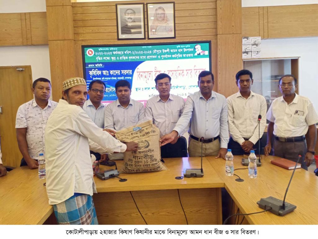 গোপালগঞ্জের কোটালীপাড়া উপজেলায় খরিপ মৌসুমে উপশী আমন ধান উৎপাদন বৃদ্ধির লক্ষে ক্ষুদ্র ও প্রান্তিক কিষাণ কিষাণীদের মাঝে বিনামূল্যে আমন ধান বীজ ও সার বিতরণ করা হয়েছে।বৃহস্পতিবার (১৫ জুন) উপজেলা পরিষদ হলরুমে উপজেলা কৃষি সম্প্রসারণ অধিদপ্তরের পক্ষ থেকে ২হাজার কিষাণ কিষাণীর মাঝে বিনামূল্যে আমন ধান বীজ ও সার বিতরণ করা হয়।গোপালগঞ্জ কৃষি সম্প্রসারণ অধিদপ্তরের উপপরিচালক কৃষিবিদ আঃ কাদের সরদার প্রধান অতিথি হিসেবে উপস্থিত থেকে এসব বীজ ও সার বিতরণ করেন।