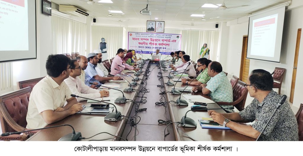 গোপালগঞ্জের কোটালীপাড়ায় মানবসম্পদ উন্নয়নে বাপার্ডের ভূমিকা শীর্ষক দিনব্যাপী কর্মাশালা অনুষ্ঠিত হয়েছে।মঙ্গলবার (২০ জুন) বঙ্গবন্ধু দারিদ্র্য বিমোচন ও পল্লী উন্নয়ন একাডেমির (বাপার্ড) আয়োজনে প্রতিষ্ঠানটির কনফারেন্স রুমে এ কর্মশালা অনুষ্ঠিত হয়।বাপার্ডের মহাপরিচালক (অতিরিক্ত সচিব) মোহাঃ বোরহানুল হক প্রধান অতিথি হিসেবে উপস্থিত থেকে দিনব্যাপী এ কর্মাশালার উদ্বোধন করেন।