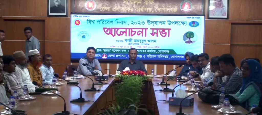 আলোচনা সভা ও পুরস্কার বিতরণের মধ্যে দিয়ে গোপালগঞ্জে বিশ্ব পরিবেশ দিবস পালিত হয়েছে। গোপালগঞ্জ জেলা প্রশাসন ও পরিবেশ অধিদপ্তর এ অনুষ্ঠানের আয়োজন করে।সোমবার (০৫মে) বেলা ১১টায় জেলা প্রশাসকের কার্যালয়ের হল রুমে অতিরিক্ত জেলা প্রশাসক (শিক্ষা ও আইসিটি) মোঃ গোলাম কবিরের সভাপতিত্বে অনুষ্ঠিত আলোচনা সভায় পরিবেশ অধিদপ্তরের গোপালগঞ্জ কার্যালয়ের সহকারী পরিচালক মোঃ আসাদুজ্জামান বক্তব্য রাখেন। এ সভায় জেলার বিভিন্ন পরিবেশবাদী সংগঠনের নেতৃবৃন্দ অংশ নেন। পরে আলোচনা সভা শেষে চিত্রাংকন প্রতিযোগিতার বিজয়ীদের মধ্যে পুরস্কার বিতরণ করা হয়।সভায়, পরিবেশকে দূষণের হাত থেকে বাঁচাতে পলিথিন ব্যবহার বন্ধ ও বৃক্ষ রোপনসহ বিভিন্ন বিষয়ে আলোচনা করা হয়।