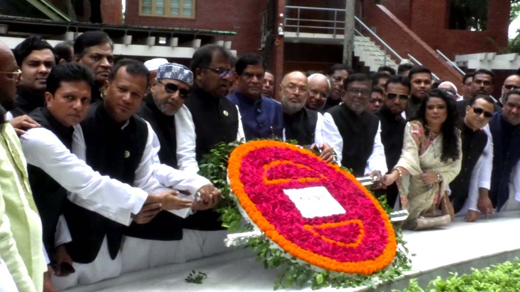 সর্বকালের সর্বশ্রেষ্ঠ বাঙালি জাতির পিতা বঙ্গবন্ধু শেখ মুজিবুর রহমানের সমাধিতে শ্রদ্ধা নিবেদন করেছেন ঢাকা জেলা আওয়ামী লীগ নেতৃবৃন্দ। সোমবার (১৯ জুন) ঢাকা জেলা আওয়ামী লীগের সভাপতি বীর মুক্তিযোদ্ধা বেনজীর আহমদ এমপি ও সাধারণ সম্পাদক পনিরুজ্জামান তরুনের নেতৃত্বে ঢাকা জেলা আওয়ামী লীগ নেতৃবৃন্দ গোপালগঞ্জের টুঙ্গিপাড়ায় পৌঁছে জাতির পিতা বঙ্গবন্ধু শেখ মুজিবুর রহমানের সমাধি সৌধের বেদীতে ফুল দিয়ে শ্রদ্ধা জানান। এসময় দুর্যোগ ব্যবস্থাপনা ও ত্রান প্রতিমন্ত্রী ডাঃ মোঃ এনামুর রহমান এমপিসহ ঢাকা জেলা আওয়ামী লীগের কার্যনির্বাহী সংসদ ও উপদেষ্টা পরিষদের সদস্যবৃদ উপস্থিত ছিলেন।পরে তারা পবিত্র ফাতেহা পাঠ করে জাতির পিতা বঙ্গবন্ধু শেখ মুজিবুর রহমান ও ১৯৭৫ এর ১৫ আগস্টের শহীদদের রুহের মাগফেরাত কামনায় বিশেষ দোয়া ও মোনাজাত করেন।