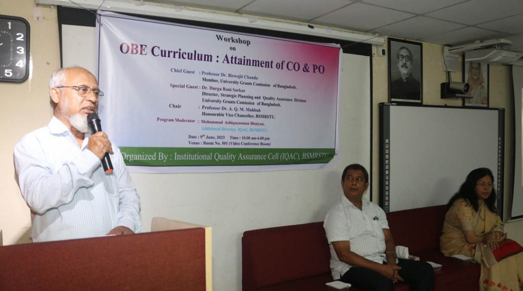 কর্মশালায় সভাপতির বক্তব্যে ভাইস-চ্যান্সেলর প্রফেসর ড. এ. কিউ. এম. মাহবুব বলেন,  বিশ্ববিদ্যালয়ে ওবিই কারিকুলাম প্রণয়ন ও বাস্তবায়নের সবচেয়ে বড় বাধা হলো আমাদের শিক্ষক স্বল্পতা। তিনি অতিদ্রুতএ বিশ্ববিদ্যালয়ে পর্যাপ্ত সংখ্যক শিক্ষকের পদ ছাড় করার জন্য ইউজিসি’র প্রতি আহবান জানান।