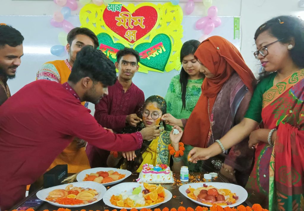 এদিন বিকাল ৫টা থেকেই এনিম্যাল সায়েন্স এন্ড ভেটেরিনারি মেডিসিন বিভাগের করিডরে জড়ো হতে থাকে মীমের সহপাঠীরা। একাডেমিক ভবনের ১১৫ নং রুমে নিজ ক্লাসরুমে সহপাঠীরা মুহূর্তেই তৈরি করে ফেলে গায়ে হলুদের মঞ্চ।