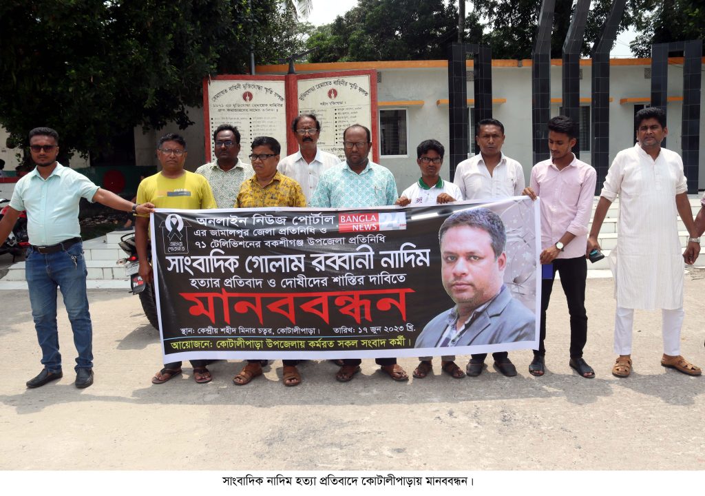 অনলাইন নিউজ পোর্টাল বাংলানিউজটোয়েন্টিফোরডটকমের জামালপুর জেলা প্রতিনিধি ও ৭১ টেলিভিশনের বকশীগঞ্জ উপজেলা প্রতিনিধি সাংবাদিক গোলাম রাব্বানী নাদিম হত্যার প্রতিবাদ ও দোষীদের শাস্তির দাবিতে গোপালগঞ্জের কোটালীপাড়ায় মানববন্ধন কর্মসূচি পালন করা হয়েছে।