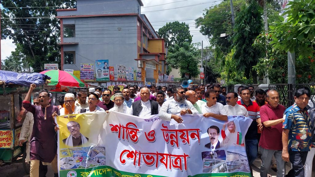 গোপালগঞ্জে শান্তি ও উন্নয়ন শোভা যাত্রা করেছে জেলা আয়ামী লীগ। বুধবার (১৯ জুলাই) সকাল ১১ টায় গোপালগঞ্জ জেলা আওয়ামী লীগ কার্যালয় থেকে একটি শোভাযাত্রা বের করা হয়। প্রধানমন্ত্রী শেখ হাসিনার নেতৃত্বে উন্নয়ন অগ্রযাত্রাকে অব্যাহত রাখার প্রত্যায়ে কেন্দ্রীয় কর্মসুচির অংশ হিসেবে এ শোভাযাত্রার আয়োজন করে। শোভাযাত্রাটি জেলা শহরের বিভিন্ন সড়ক প্রদক্ষিণ করে শহরের চৌরঙ্গীতে গিয়ে শেষ হয়। সেখানে জেলা আওয়ামী লীগ সভাপতি মাহাবুব আলী খানের সভাপতিত্বে আলোচনা সভায় বক্তব্য রাখেন জেলা আওয়ামী লীগের যুগ্ম,সাধারণ সম্পাদক সুব্রত ঠাকুর, মুশফিকুর রহমান লিটন,পৌর আওয়ামীলীগ সভাপতি গোলাম কবির, জেলা আওয়ামী লীগের দপ্তর সম্পাদক ইলিয়াস হক,যুবলীগের সাধারণ সম্পাদক এম বি সাঈফ বি ও সদর উপজেলা যুবলীগ সভাপতি জায়েদ মোহম্মদ বাপী প্রমূখ।