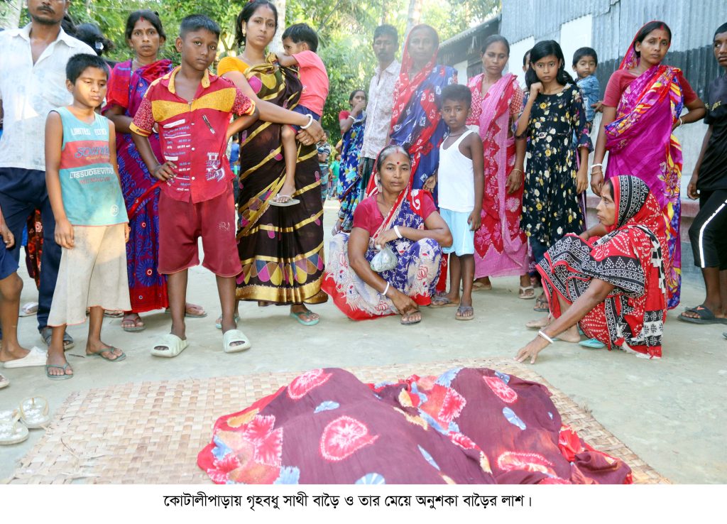 টিনের ঘরের আড়ার সাথে ঝুলছিল সাথী বাড়ৈ (২৪) নামে এক গৃহবধুর লাশ। পাশেই মাটিতে পড়ে ছিল তারই ৬মাসের কন্যা শিশুর লাশ। নিজ সন্তানকে হত্যার পর মা আত্মহত্যা করেছে বলে ধারনা করছে এলাকাবাসী।