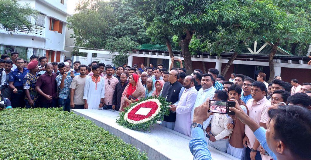 পরে ১৯৭৫ এর ১৫ আগষ্ট নিহত বঙ্গবন্ধু ও তাঁর পরিবারের নিহত সদস্যদ্যের প্রতি শ্রদ্ধা জানিয়ে এক মিনিট নীরবতা পালন এবং ফাতেহাপাঠ করে দোয়া ও মোনাজাত করেন তিনি।
