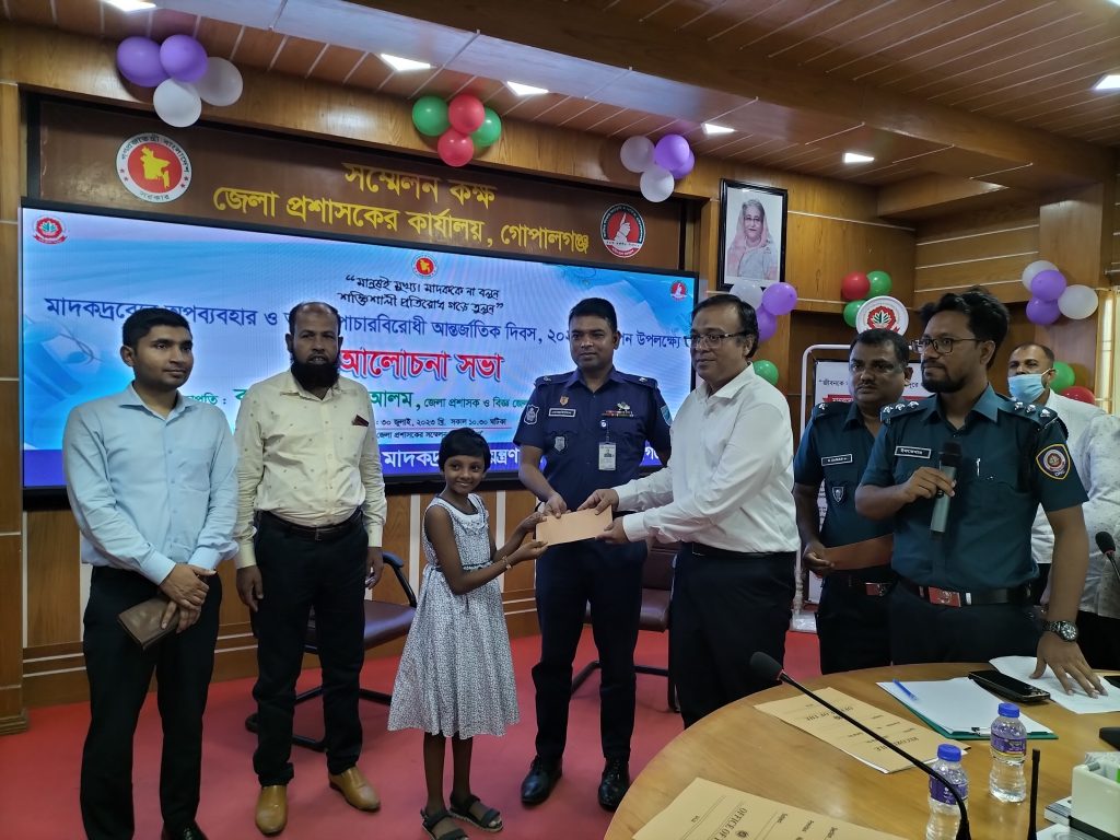 ‘মানুষই মুখ্য। মাদককে না বলুন,শক্তিশালী প্রতিরোধ গড়ে তুলুন’ এই প্রতিপাদ্যে গোপালগ‌ঞ্জে, আলোচনা সভা ও পুরস্কার বিতরণীর মধ্য দিয়ে মাদক দ্রব্যের অপব্যবহার ও অবৈধ পাচার বিরাধী আন্তর্জাতিক দিবস উদযাপিত হয়েছে।রবিবার (৩০ জুলাই) এ উপলক্ষে জেলা প্রশাসকের কার্যালয়ের সামনে থেকে শহরে একটি বর্ণাঢ্য র‌্যালী বের করা হয়। শহরের প্রধান প্রধান সড়ক ঘুরে র‌্যালীটি জেলা প্রশাসকের কার্য়ালয়ে গিয়ে শেষ হয়। পরে জেলা প্রশাসকের সম্মেলন কক্ষে অতিরিক্ত জেলা ম্যাজিস্ট্রেট মোঃ আমিনুর রহমানের সভাপতিত্বে অনুষ্ঠিত আলোচনা সভায় অতিরিক্ত পুলিশ সুপার মোহাইমিনুল ইসলাম, গোপালগঞ্জ জেলা কারাগারের সুপার মোঃ আল মামুন, মাদকদ্রব্য নিয়ন্ত্রণ অধিদপ্তরের গোপালগঞ্জ জেলা কার্যালয়ের সহকারী পরিচালক ইফতেখার মোহাম্মদ উমায়ের, সিভিল সার্জনের প্রতিনিধি ডা. সাদ মোহাম্মদ জয়, জেলা ক্রীড়া অফিসার মোঃ মনিরুজ্জমান, মহিলা বিষয়ক অধিদপ্তরের গোপালগঞ্জ জেলা কার্যালয়ের উপ-পরিচালক মোঃ সাইফুল ইসলাম সহ আরো অনেকে বক্তব্য রাখেন।পরে মাদক দ্রব্যের অপব্যবহার ও অবৈধ পাচার বিরাধী আন্তর্জাতিক দিবস উপলক্ষে আয়োজিত রচনা এবং চিত্রাংকন প্রতিযোগিতার বিজয়ীদের হাতে পুরস্কার তুলে দেন অতিরিক্ত জেলা ম্যাজিস্ট্রেট মোঃ আমিনুর রহমান সহ অন্যান্যরা ।