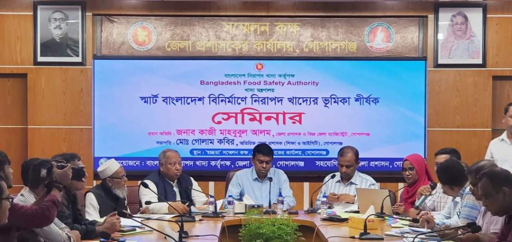 স্মার্ট বাংলাদেশ  বিনির্মাণে গোপালগঞ্জে নিরাপদ  খাদ্য কর্তৃপক্ষের ভূমিকা শীর্ষক সেমিনার অনুষ্ঠিত হয়েছে। বৃহস্পতিবার (১৩ জুলাই) সকালে জেলা প্রশাসকের সম্মেলন কক্ষে বাংলাদেশ নিরাপদ খাদ্য কর্তৃপক্ষ ও জেলা প্রশাসন এ সেমিনারের  আয়োজন করে। অনুষ্ঠানে প্রধান অতিথির বক্তব্য দেন জেলা প্রশাসক কাজী মাহবুবুল আলম।বাংলাদেশ নিরাপদ খাদ্য কর্তৃপক্ষের গোপালগঞ্জ জেলা কার্যালয়ের নিরাপদ খাদ্য কর্মকর্তা মুন্নী খাতুন এ সেমিনারে পাওয়ার পয়েন্ট প্রেজেন্টেশন করেন।