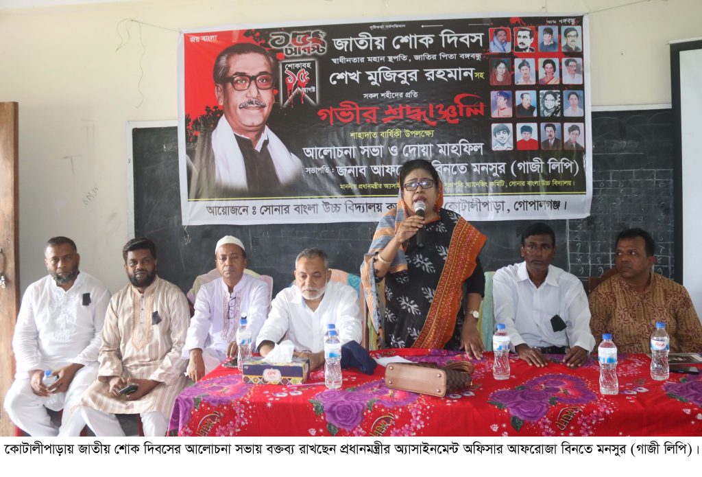 বুধবার (১৬ আগস্ট) গোপালগঞ্জের কোটালীপাড়া উপজেলার সোনার বাংলা উচ্চ বিদ্যালয় আয়োজিত বিদ্যালয়ের হলরুমে অনুষ্ঠিত জাতীয় শোক দিবসের আলোচনা সভায় প্রধান অতিথির বক্তব্যে তিনি এসব কথা বলেন।