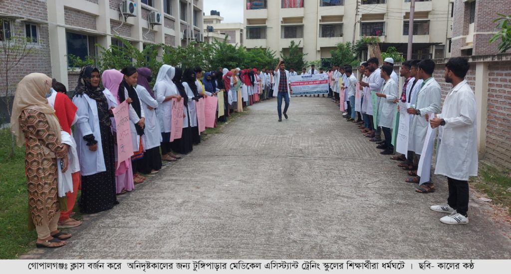 গোপালগঞ্জের টুঙ্গিপাড়ায় ইন্টার্নশিপ বহাল সহ চার দফা দাবিতে অনির্দিষ্টকালের জন্য ক্লাস বর্জন করে আন্দোলনে নেমেছেন মেডিকেল অ্যাসিস্ট্যান্ট ট্রেনিং স্কুল (ম্যাটস) এর শিক্ষার্থীরা।
