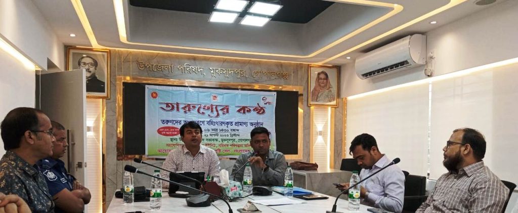 গোপালগঞ্জের মুকসুদপুরে বাল্যবিবাহ প্রতিরোধে সচেতনতা মূলক অনুষ্ঠান তারুণ্যের কণ্ঠ অনুষ্ঠিত হয়েছে। সোমবার (২১ আগষ্ট) সকালে মুকসুদপুর উপজেলা পরিষদ সভাকক্ষে বাংলাদেশ বেতারের আয়োজনে বাল্যবিবাহ প্রতিরোধে সচেতনতা মূলক অনুষ্ঠান তারুণ্যের কন্ঠ অনুষ্ঠিত হয়।