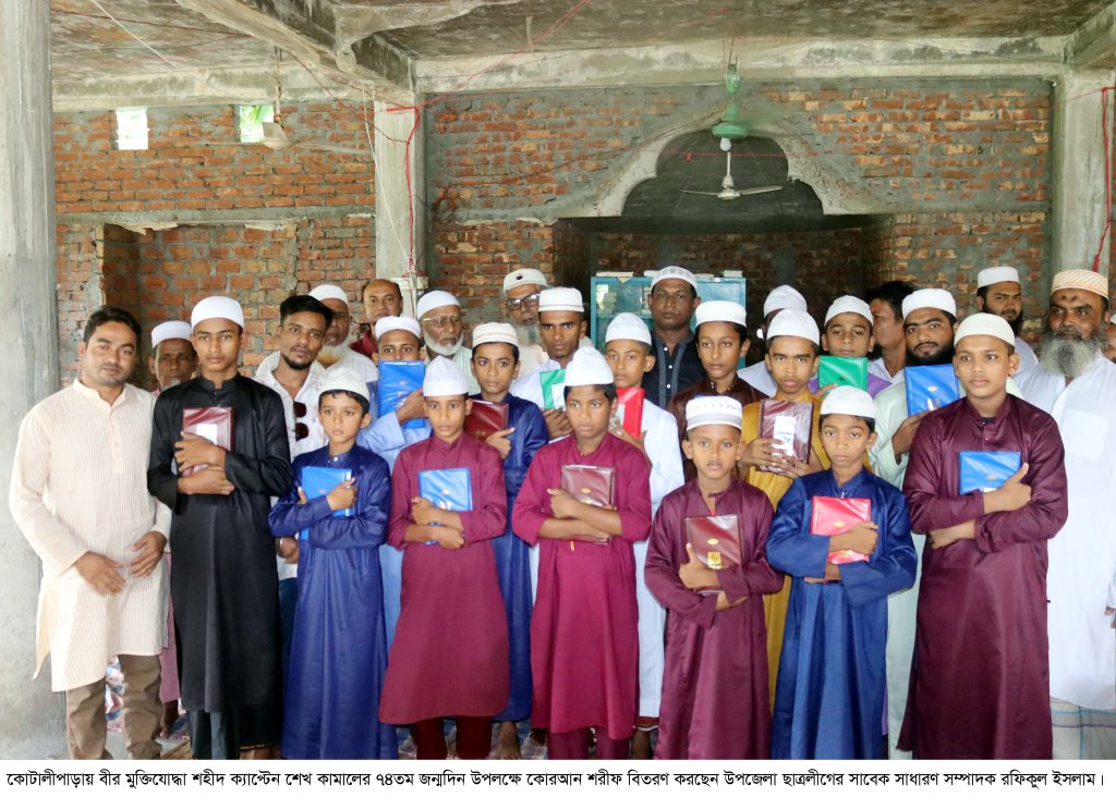 গোপালগঞ্জের কোটালীপাড়ায় জাতির পিতা বঙ্গবন্ধু শেখ মুজিবুর রহমানের জ্যেষ্ঠ পুত্র বীর মুক্তিযোদ্ধা শহীদ ক্যাপ্টেন শেখ কামালের ৭৪তম জন্মদিন উপলক্ষে কোরআন শরীফ বিতরণ করেছেন উপজেলা ছাত্রলীগের সাবেক সাধারণ সম্পাদক রফিকুল ইসলাম।