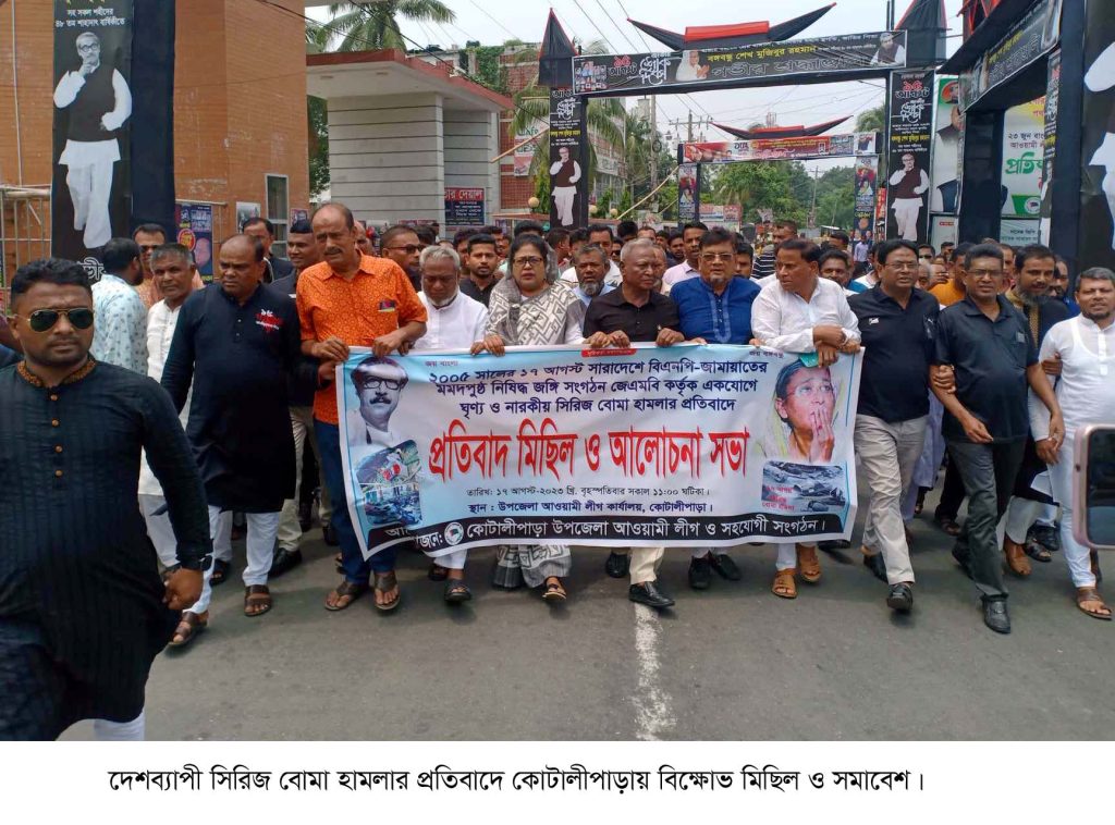 ২০০৫ সালে ১৭ আগস্ট জঙ্গি সংগঠন জেএমবি কর্তৃক দেশব্যাপী সিরিজ বোমা হামলার প্রতিবাদে গোপালগঞ্জের কোটালীপাড়া উপজেলায় বিক্ষোভ মিছিল ও সমাবেশ করেছে উপজেলা আওয়ামী লীগ এবং সহযোগি সংগঠন।