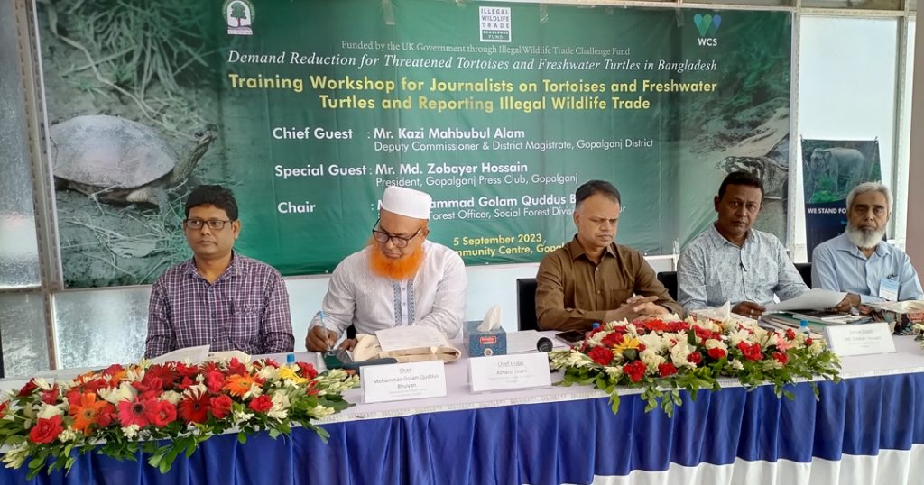 মঙ্গলবার ( ৫ সেপ্টেম্বর) সকালে শহরের পৌর কমিউনিটি সেন্টারে অনুষ্ঠিত প্রশিক্ষণ কর্মশালায় প্রধান অতিথি ছিলন গোপালগঞ্জ জেলা প্রশাসকের কার্যালয়ের স্থানীয় সরকার বিভাগের উপ-পরিচালক আজাহারুল ইসলাম। ফরিদপুর সামাজিক বন বিভাগের বিভাগীয় বন কর্মকর্তা  মোহাম্মদ গোলাম কুদ্দুছ ভূঁইয়ার সভাপতিত্বে উদ্বোধনী অনুষ্ঠানে গোপালগঞ্জ প্রেসক্লাবের সভাপতি মোঃ জোবায়ের হোসাইন, ডাব্লিউসিএস বাংলাদেশের কান্ট্রি রিপ্রেজেন্টেটিভ ড. মোঃ জাহাঙ্গীর আলম, কোঅর্ডিনেটর  সামিউল মোহসেনিন বক্তব্য রাখেন। ওয়াইল্ডলাইফ কনজারভেশন সোসাইটির (ডাব্লিউসিএস) দিনব্যাপী প্রশিক্ষণ কর্মশালায়  গোপালগঞ্জ, যশোর, মাদারিপুর, ফরিদপুর, রাজবাড়িসহ ৮ জেলার অর্ধশতাধিক গণমাধ্যম কর্মী অংশ নেন।প্রশিক্ষকগণ কর্মশালায় কচ্ছপ ও স্বাদু পানির কচ্ছপ এবং বন্যপ্রাণীর অবৈধ বাণিজ্য বন্ধ বিষয়ে ও আইনগত পদক্ষেপ নিয়ে আলোচনা এবং সাংবাদিকদের সংবাদ পরিবেশন নিয়ে আলোচনা করা হয়।