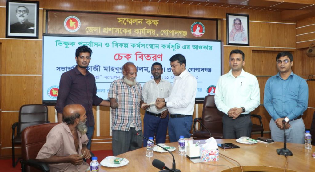 গোপালগঞ্জে ভিক্ষুক পুনর্বাসন ও বিকল্পকর্মসূচীর আওতায় চেক বিতরণ করা হয়েছে। সোমবার (১১ সেপ্টেম্বর) দুপুরে জেলা প্রশাসক কাজী মাহবুবুল আলম ভিক্ষুকদের হাতে সাহায্যেরচেক তুলেদেন। জেলা প্রশাসকের সম্মেলন কক্ষে আয়োজিত এ অনুষ্ঠানে অতিরিক্ত জেলা প্রশাসক (সার্বিক) শেখ জোবায়ের আহমেদ, সমাজসেবা অধিদপ্তরের গোপালগঞ্জ জেলা কার্যালয়ের উপ-পরিচালক মোঃ হারুন-অর রশীদ সহ আরো অনেকে বক্তব্য রাখেন। সমাজসেবা অধিদপ্তরের ভিক্ষুক পুনর্বাসন ও বিকল্পকর্মসূচীর আওতায় ৬ জন ভিক্ষুকের হাতে মোট ১ লাখ ৯৫ হাজার টাকার চেক তুলে দেন জেলা প্রশাসক কাজী মাহবুবুবল আলম।সমাজসেবা অধিদপ্তরের গোপালগঞ্জ জেলা কার্যালয়ের উপ-পরিচালক মোঃ হারুন-অর রশীদ বলেন, তারা ভিক্ষাবৃত্তি ছেড়ে এ টাকা দিয়ে মুদি, চায়ের দোকান সহ ছোটখাট ব্যবসা পরিচালনা করবেন। এরমধ্যদিয়েই তাদের বিকল্প কর্মসংস্থানের সৃষ্টি হবে।