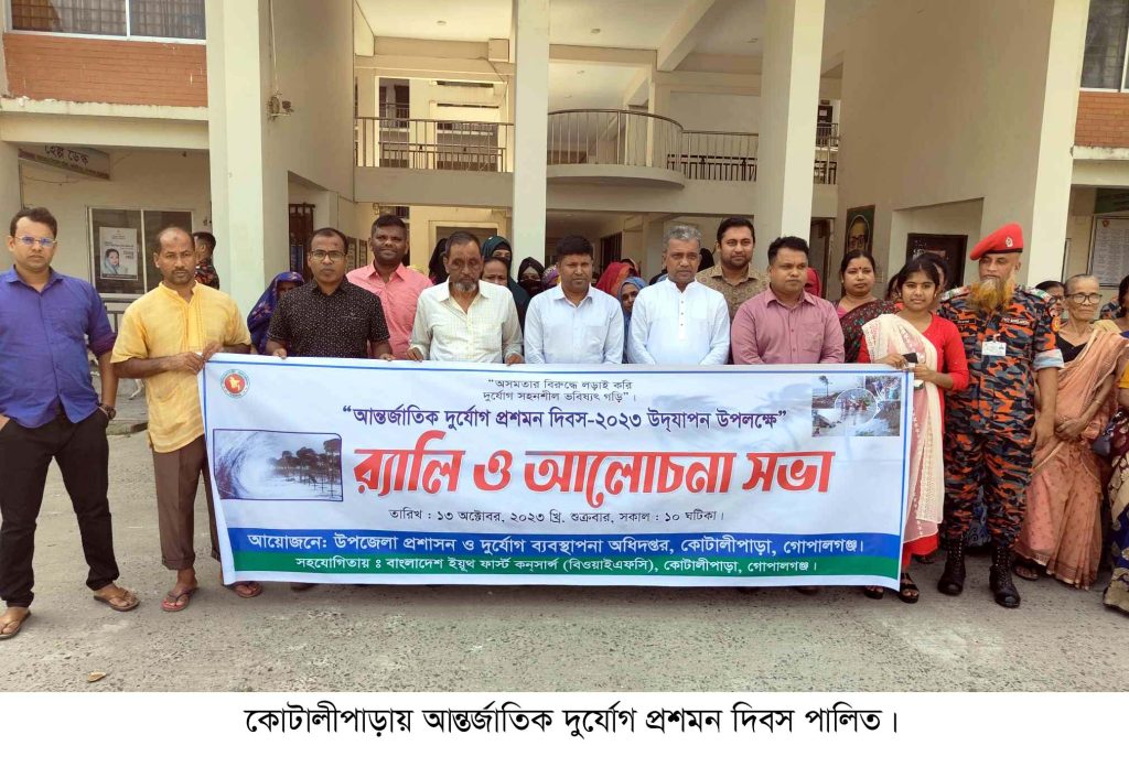 গোপালগঞ্জের কোটালীপাড়ায় নানা আয়োজনের মধ্য দিয়ে আন্তর্জাতিক দুর্যোগ প্রশমন দিবস পালিত হয়েছে।এ উপলক্ষে শুক্রবার (১৩ অক্টোবর) উপজেলা প্রশাসন ও দুর্যোগ ব্যবস্থাপনা অধিদপ্তরের আয়োজনে একটি শোভাযাত্রা শিল্পকলা একাডেমি চত্ত্বর থেকে শুরু হয়ে শহরের প্রধান প্রধান সড়ক প্রদক্ষিণ করে উপজেলা পরিষদ চত্ত্বরে এসে একটি আলোচনা সভায় মিলিত হয়।