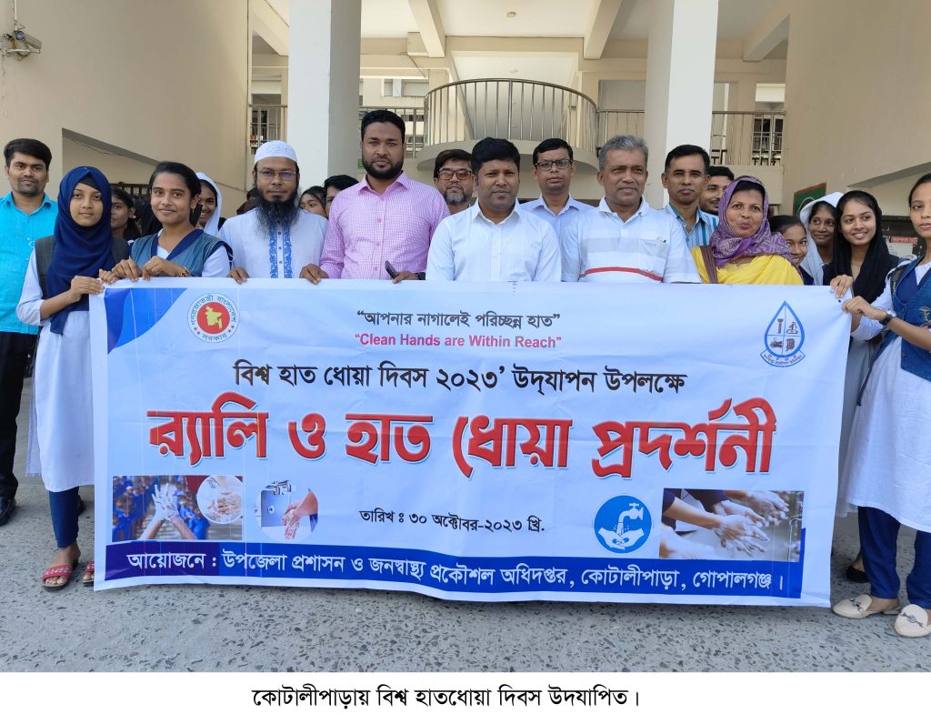 গোপালগঞ্জের কোটালীপাড়ায় বিশ্ব হাত ধোয়া দিবস উদযাপিত হয়েছে। এ উপলক্ষে সোমবার (৩০ অক্টোবর) উপজেলা প্রশাসন ও জনস্বাস্থ্য প্রকৌশল অধিদপ্তরের আয়োজনে একটি র্যালি উপজেলার শিল্পকলা একাডেমি চত্ত্বর থেকে শুরু হয়ে শহরের প্রধান প্রধান সড়ক প্রদক্ষিণ করে উপজেলা পরিষদ চত্ত্বরে এসে শেষ হয়। সেখানে একটি আলোচনা সভায় মিলিত হয় সবাই।আলোচনা সভায় উপজেলা নির্বাহী অফিসার ফেরদৌস ওয়াহিদ, পৌর মেয়র মতিয়ার রহমান হাজরা, উপজেলা জনস্বাস্থ্য প্রকৌশল অধিদপ্তরের উপ-সহকারী প্রকৌশলী মোঃ আকির খান বক্তব্য রাখেন।আলোচনা সভা শেষে বিভিন্ন শিক্ষা প্রতিষ্ঠানের শিক্ষার্থীদেরকে হাত ধোয়া শিখানো হয়।