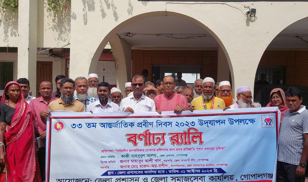 নানান আয়োজনে গোপালগঞ্জে ৩৩ তম আন্তর্জাতিক প্রবীণ দিবস পালিত হয়েছে।রবিবার (১০ অক্টোবর) সকালে জেলা প্রশাসকের কার্যালয়ের সামনে থেকে একটি র্যালী বের হয়ে বিভিন্ন সড়ক প্রদক্ষিণ করে একই স্থানে এসে শেষ হয়।র্যালীতে অতিরিক্ত জেলা প্রশাসক (শিক্ষা ও আইসিটি) গোলাম কবির, জেলা সমাজসেবা কার্যালয়ের উপপরিচালক মো. হারুন-অর-রশীদ, সহকারি পরিচালক মো. জুলফিকার আলী, সাবেক জেলা মুক্তিযোদ্ধা কমান্ডার এম বদরুদ্দোজা বদর, সমাজসেবা অফিসার (রেজিঃ) প্রকাশ কুমার বিশ্বাস, সমাজসেবা অফিসার ফারহানা নাসরিণ, নবীনবাগ যুব সংঘের সভাপতি মো. শফিকুজ্জামান বিশ্বাস সহ বিভিন্ন সংগঠনের প্রতিনিধি ও প্রবীণরা উপস্থিত ছিলেন।পরে জেলা প্রশাসকের সম্মেলন কক্ষে “সর্বজনীন মানবাধিকার ঘোষণায় প্রবীণদের জন্য প্রদত্ত প্রতিশ্রুতি পূরণে প্রজন্মের ভূমিকা” শীর্ষক আলোচনা সভা অনুষ্ঠিত হয়।সভায় প্রধান অতিথি হিসেবে উপস্থিত ছিলেন অতিরিক্ত জেলা প্রশাসক (শিক্ষা ও আইসিটি) গোলাম কবির। অনুষ্ঠানে সভাপতিত্ব করেন জেলা সমাজসেবা কার্যালয়ের উপপরিচালক মো. হারুন-অর-রশীদ।জেলা প্রশাসন ও জেলা সমাজসেবা কার্যালয় এ কর্মসূচির আয়োজন করে।