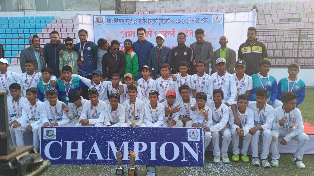 গোপালগঞ্জে ইয়াং টাইগার্স অনূর্ধ্ব-১৪ জাতীয় ক্রিকেট টুর্নামেন্টের ফাইনালে ঢাকা জেলাকে ১১৭ রানে হারিয়ে গোপালগঞ্জ জেলা চ্যাম্পিয়ন হয়েছে। রোববার (৩১ ডিসেম্বর)সকাল ১০টায় গোপালগঞ্জে শেখ কামাল ক্রিকেট স্টেডিয়ামে ঢাকা জেলার মুখোমুখি হয় গোপালগঞ্জ জেলা। তবে আবহাওয়া খারাপ থাকায় ৫০ ওভারের ম্যাচ নেমে আসে ৩৮ ওভারে। টসে জিতে প্রথমে ব্যাটিং করে গোপালগঞ্জ জেলা নির্ধারিত ওভারে ৪ উইকেট হারিয়ে ১৯১ রান করে। জবাবে ১৯২ রানের লক্ষ্য তাড়া করতে নেমে গোপালগঞ্জ জেলার বোলিং তোপে ৩৭.৫ ওভারে সব কয়টি উইকেট হারিয়ে মাত্র ৭৪ রান করতে পারে ঢাকা জেলা। ফলে ঢাকা জেলাকে ১১৭ রানে হারিয়ে গোপালগঞ্জ জেলা চ্যাম্পিয়ন হয়।
