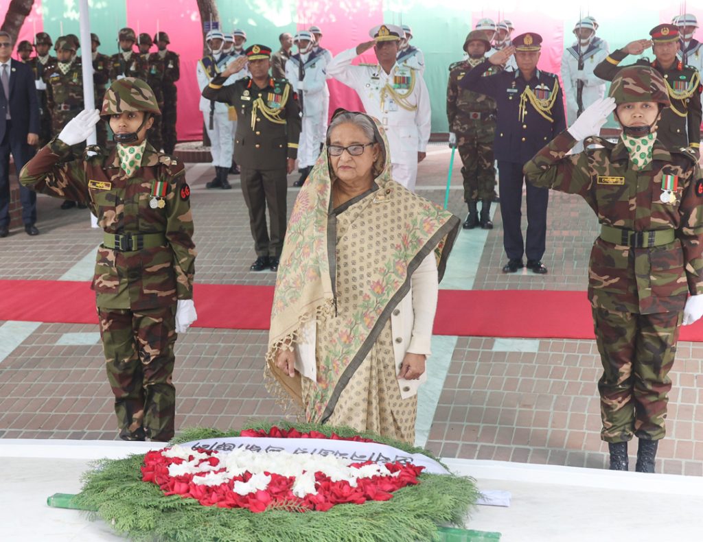 পরে নবগঠিত মন্ত্রী পরিষদের সদস্যদের সাথে নিয়ে তিনি জাতির পিতার সমাধিতে শ্রদ্ধা জানান।এ সময় তিন বাহিনীর একটি চৌকস দল প্রধানমন্ত্রীকে গার্ড অব অনার প্রদান করেন।