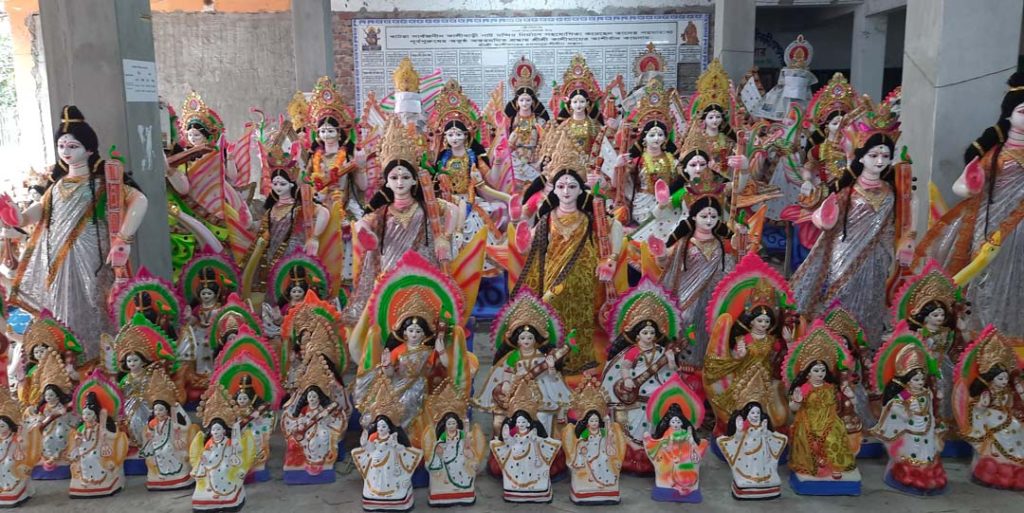 প্রতি বছরের মত এবছরও বুধবার শুক্লাপক্ষের পঞ্চমী তিথিতে সনাতন ধর্মাবলম্বীদের বাড়িতে ও বিভিন্ন মন্দিরে নানা আয়োজনের মধ্য দিয়ে অনুষ্ঠিত হবে দেবী স্বরসতী পূঁজা। তিথি শুরু হবে মঙ্গলবার (১৩ ফেব্রæয়ারী) বেলা ২টা ৪১ মিনিটে। আর শেষ হবে পরের দিন বুধবার (১৪ফেব্রæয়ারী) বেলা ১২টা পর্যন্ত। এ পূজার প্রধান অনুসঙ্গ হল প্রতিমা। জেলা শহরের গোহাট সার্বজনীন কালীবাড়ীসহ জেলার অর্ধ শতাধিক স্থানে সরস্বতী প্রতিমার হাট বসেছে। আর প্রতিমা বিক্রির জন্য এসব হাটে মূর্তি নিয়ে এসেছেন কারিগররা। এসব প্রতিমা বেচাবিক্রি চলবে মঙ্গলবার রাত পর্যন্ত। মানুষ পছন্দ আর সাধ্য মত কিনছেন এসব প্রতিমা। তবে এ বছর প্রতিমার দাম অন্যান্য বছরের তুলনায় একটু বেশি বলে দাবী করেন ক্রেতারা। এছাড়া শিক্ষার্থীরা অধীর অগ্রহে সারা বছর অপেক্ষা করে থাকেন দেবীর পায়ে অঞ্জলী দেবার জন্য।