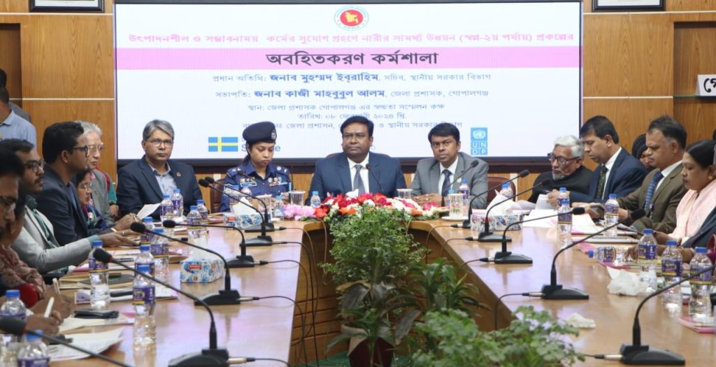 গোপালগঞ্জে উৎপাদনশীল ও সম্ভাবনাময় কর্মের সুযোগ গ্রহনে নারীর সামর্থ্য উন্নয়ন(স্বপ্ন-২য় পর্যায়)শীর্ষক এক কর্মশালা অনুষ্ঠিত হয়েছে।বৃহস্পতিবার(০৮ ফেব্রুয়ারী) সকালে জেলা প্রশাসকের সম্মেলন কক্ষে এ কর্মশালায় অনুষ্ঠত হয়। বাংলাদেশ সরকারের স্থানীয় সরকার বিভাগের সচিব মুহাম্মদ ইব্রাহিম। প্রধান অতিথি হিসাবে কর্মশালার উদ্বোধন করেন। জেলা প্রশাসক কাজী মাহবুবুল আলম-এর সভাপতিত্বে অনুষ্ঠিত এ কর্মশালায় বিশেষ অতিথি হিসাবে বক্তব্য রাখেন স্থানীয় সরকার বিভাগ ও জাতীয় প্রকল্প পরিচালক যুগ্মসচিব আবু সেলিম মাহমুদ-উল হাসান, ইউএনডিপি বাংলাদেশ, এআরআর প্রসেনজিৎ চাকমা, জেলা পরিষদ চেয়ারম্যান মুন্সী আতিয়ার রহমান,