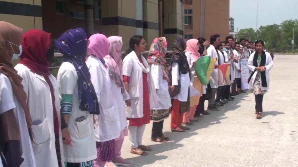 বঙ্গবন্ধু শেখ মুজিব মেডিকেল বিশ্ববিদ্যালয়ের অধীনস্থ ১২টি ইন্সটিটিউট এর আবাসিক ও অনাবাসিক ডাক্তারদের ভাতা পুরনায় চালু এবং চিকিৎসক সুরক্ষা আইন ও চিকিৎসকদের নিরাপদ কর্মস্থল নিশ্চিতকরন।মানববন্ধন চলাকালে ইন্টার্ন চিকিৎসক অনামিকা জাহান আঁখি, আরাফাত হোসেন, আবু শাকির বক্তব্য রাখেন।বক্তারা বলেন, একটি হাসপাতালের প্রাণ হচ্ছে ইন্টার্ন চিকিৎসকেরা। কিন্তু আমাদের ভাতা অনেক কম। চার দফা দাবী আদায়ের লক্ষ্যে আগামী ২৯ মার্চ পর্যন্ত আমাদের আন্দোলন চলবে। এরমধ্যে দাবী পূরণ না হলে বৃহত কর্মসূচী ঘোষনা করা হবে।