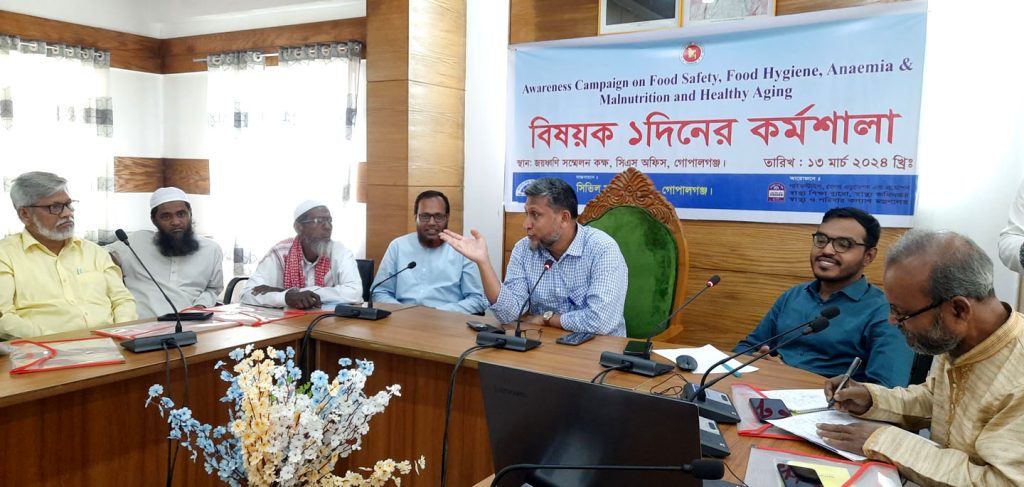কালের খবরঃগোপালগঞ্জে খাদ্য নিরাপত্তা, স্বাস্থ্যবিধি, রক্তশূন্যতা,অপুষ্টি, স্বাস্থ্য সচেতনতা ও প্রচারাভিযান বিষয়ক দিনব্যাপী কর্মশালা অনুষ্ঠিত হয়েছে। (Awareness Campaign on Food Safty, Food Hygiene, Anaemia & Malnutrition and Healthy aging)বুধবার(১৩ মার্চ)সকালে সিভিল সার্জন কার্যালয়ের হল রুমে অনুষ্ঠিত কর্মশালায় সভাপতিত্ব করেন সিভিল সার্জন ডাঃ মোঃ জিল্লুর রহমান।