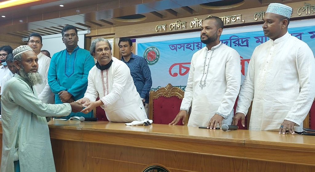 আসন্ন ইদুল ফিতর উপলক্ষে গোপালগঞ্জ পৌরসভার উদ্যোগে অসহায় ও দরিদ্র পরিবারের মধ্যে আর্থিক অনুদানের চেক বিতরণ করা হয়েছে।সোমবার(১ এপ্রিল) সকাল সাড়ে ১১ টায় পৌরসভার শেখ সেলিম পৌর মিলনায়তনে পৌর মেয়র শেখ রকিব হোসেন সভাপতি হিসেবে এসব চেক তুলে দেন।পৌরসভার দরিদ্র তহবিল থেকে ২৪২টি পরিবারের মধ্যে ৩, ৫ ও ১০ হাজার টাকা করে মোট ৮ লক্ষ ২৪ হাজার টাকার চেক বিতরণ করা হয়।এরআগে, অনুষ্ঠিত আলোচনাসভায় বক্তব্য রাখেন পৌর মেয়র শেখ রকিব হোসেন, পৌরসভার প্রধান নির্বাহী কর্মকর্তা এএইচএম রকিবুল ইসলাম, প্রধান নির্বাহী কর্মকর্তা মেহেদী হাসান, সমাজ উন্নয়ন কর্মকর্তা জুলফিকার আলী, জেলা স্বেচ্ছাসেবক লীগের সাধারন সম্পাদক ও পৌর কাউন্সিলর জোবায়েরুল ইসলাম ঝন্টু, কাউন্সিলর নাজমুল হাসান নাজিম প্রমুখ বক্তব্য রাখেন।