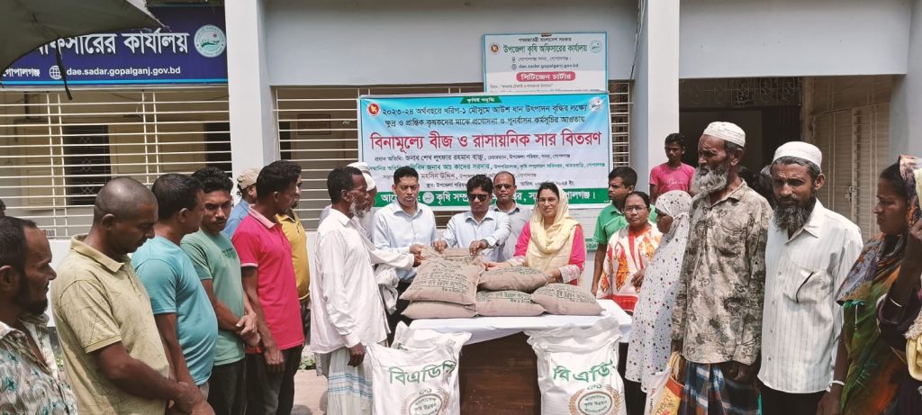 গোপালগঞ্জে ১০০০ ক্ষুদ্র ও প্রান্তিক কৃষকের মাঝে বিনামূল্যে বীজ এবং বেলা রাসায়নিক সার বিতরণ করা হয়েছে। ২০২৩-২৪ অর্থবছরে খরিপ-১ মৌসুমে আউশ ধান উৎপাদন বৃদ্ধির লক্ষ্যে প্রণোদনা ও পূনর্বাসন কর্মসূচির আওতায় এই বীজ ও সার বিতরণ করা হয়।