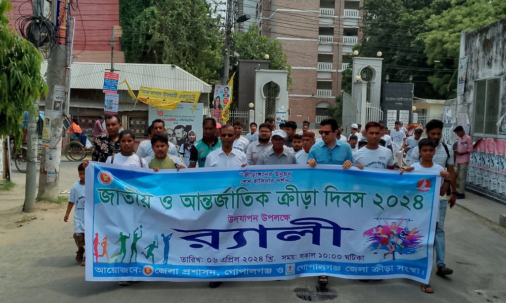 জাতীয় ও আন্তর্জাতিক ক্রীড়া দিবস উপলক্ষে গোপালগঞ্জে র্যালী ও আলোচনা সভা অনুষ্ঠিত হয়েছে। শনিবার ( ৬ এপ্রিল) সকালে জেলা প্রশাসন ও জেলা ক্রীড়া সংস্থার আয়োজনে দিবসটি পালন করা হয়। জেলা প্রশাসক  কার্যালয়ের সামনে থেকে র‌্যালীটি শুরু হয়। অতিরিক্ত জেলা প্রশাসক ( সার্বিক) গোলাম কবীরের নেতৃত্বে র‌্যালীটি  শহরের প্রধান প্রধান সড়ক প্রদক্ষিন শেষে একই স্থানে  শেষ হয়।