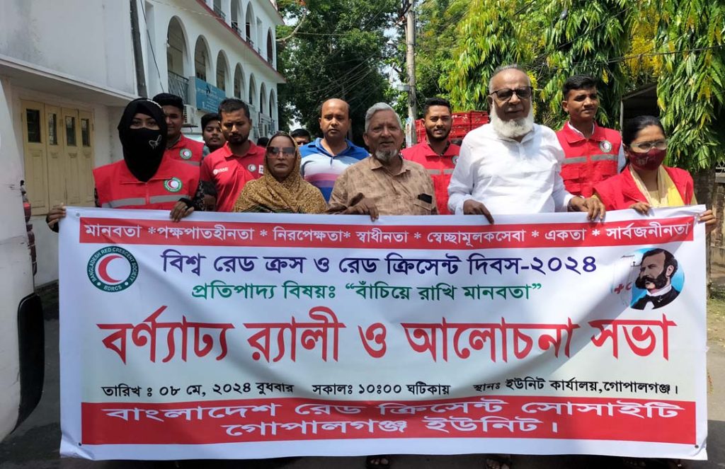 গোপালগঞ্জে শোভাযাত্রা ও আলোচনা সভার মধ্য দিয়ে আন্তর্জাতিক রেড ক্রস ও রেড ক্রিসেন্ট দিবস উদযাপন করা হয়েছে। ‘বাঁচিয়ে রাখি মানবতা’ এই প্রতিপাদ্যে গোপালগঞ্জ রেড ক্রিসেন্ট ইউনিটৈর পক্ষ থেকে শহরে একটি শোভাযাত্রা বের করা হয়। শোভাযাত্রাটি শহরের বিভিন্ন সড়ক প্রদক্ষিণ করে জেলা রেড ক্রিসেন্ট ইউনিট কার্যালয়ে গিয়ে শেষ হয়। পরে জেলা ইউনিট কার্যালয়ে অনুষ্ঠিত হয় আলোচনা সভায। সভায় ইউনিট চেয়ারম্যান ও গোপালগঞ্জ জেলা পরিষদের চেয়ারম্যান বীর মুক্তিযোদ্ধা অ্যাডভোকেট মুন্সি মো. আতিয়ার রহমান, সম্পাদক সিকদার নুর মোহাম্মদ দুলু, সদস্য লতিফা জামাল চৌধুরী সহ আরো অনেকে বক্তব্য রাখেন।