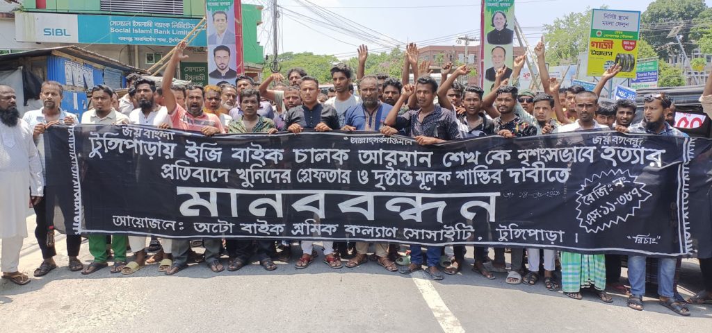 গোপালগঞ্জের টুঙ্গিপাড়ায় ইজিবাইক চালক আরমান শেখ হত্যাকান্ডে জড়িতদের গ্রেপ্তার পূর্বক শাস্তির দাবিতে ঘন্টাব্যাপী বিক্ষোভ ও মানববন্ধন করা হয়েছে। মঙ্গলবার (১৪ মে) বেলা ১২ টায় উপজেলার পাটগাতী বাসস্ট্যান্ডে মানববন্ধন করেন টুঙ্গিপাড়া অটো বাইক শ্রমিক কল্যাণ সোসাইটির সদস্যরা।বিক্ষোভ মিছিলটি উপজেলার পাটগাতী বাসস্ট্যান্ড থেকে শুরু হয়ে বিভিন্ন সড়ক প্রদক্ষিণ করে পুনরায় সেখানে গিয়ে শেষ হয়। মিছিলে ইজিবাইক চালক আরমান শেখ হত্যায় জড়িতদের গ্রেপ্তার পূর্বক দৃষ্টান্তমূলক শাস্তির দাবিতে বিভিন্ন ধরনের শ্লোগান দেন তারা।