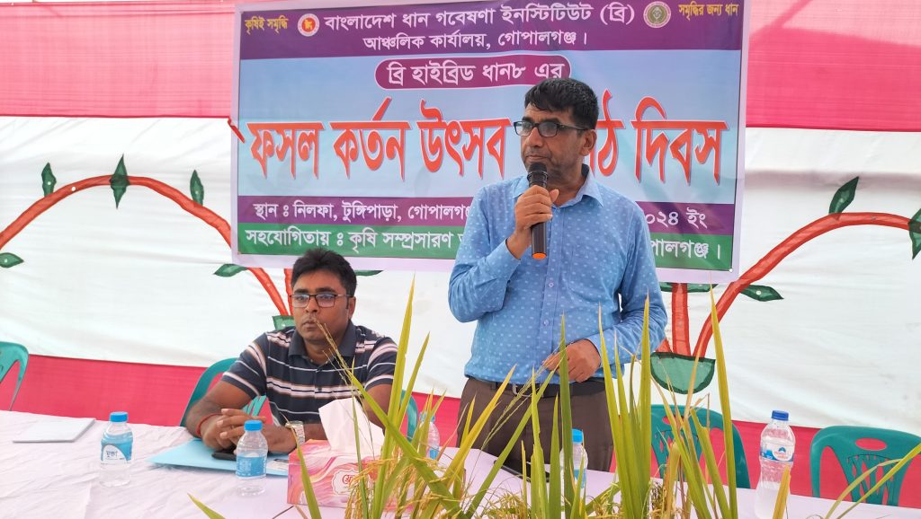 গোপালগঞ্জে বাংলাদেশ ধান গবেষণা ইনস্টিটিউট উদ্ভাবিত নতুন জাতের ব্রি হাইব্রিড ধান-৮ এর মাঠ দিবস অনুষ্ঠিত হয়েছে।বৃহস্পতিবার (৯মে)টুঙ্গিপাড়া উপজেলার কুশলী গ্রামে কৃষি সম্প্রসারণ অধিদপ্তরের সহযোগিতায় বাংলাদেশ ধান গবেষণা ইনস্টিটিউটের গোপালগঞ্জ আঞ্চলিক কার্যালয় এ মাঠ দিবসের আয়োজন করে। এতে প্রধান অতিথির বক্তব্য দেন ব্রি গোপালগঞ্জ আঞ্চলিক কার্যালয়ের প্রধান ড. মোহাম্মদ জাহিদুল ইসলাম।অন্যান্যের মধ্যে বক্তব্য রাখেন ব্রি গোপালগঞ্জ আঞ্চলিক কার্যালয়ের বৈজ্ঞানিক কর্মকর্তা সৃজন চন্দ্র দাস, কৃষক নাজমুল মোল্লা, রমজান সরদার, জাহাঙ্গীর গাজী, আরিফ গাজী, মিজান মোল্লা প্রমূখ। মাঠ দিবস থেকে জানানো হয় নতুন এ জাতের ধান হেক্টরে ১০.৫০ টন ফলন দিয়েছে। এতে টুঙ্গিপাড়া উপজেলার শতাধিক কৃষক ও কৃষাণী অংশ নেন।