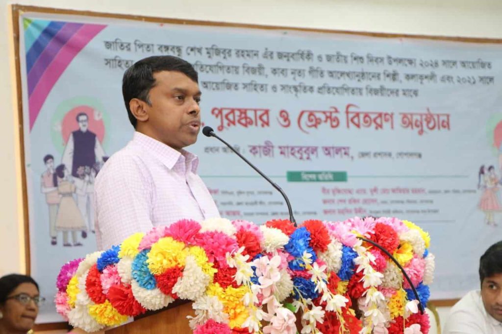 জেলা প্রশাসক কাজী মাহবুবুল আলম বলেন,জাতির পিতা বঙ্গবন্ধু শেখ মুজিবুর রহমান এর জন্মবার্ষিকী ও জাতীয় শিশু দিবস উপলক্ষ্যে ২০২৪ সালে টুঙ্গিপাড়ায় আয়োজিত সাহিত্য-সাংস্কৃতিক প্রতিযোগিতার বিজয়ীদের মধ্যে থেকে কয়েকজন প্রতিযোগি প্রধানমন্ত্রীর কাছ থেকে গত ১৭ মার্চ ক্রেস্ট গ্রহণ করে। ২০২১ সালে এ উপলক্ষ্যে আয়োজিত সাহিত্য ও সাংস্কৃতিক প্রতিযোগিতার বিজয়ীরা মহামারি করোনার কারণে সে সময়ে কোনো পুরস্কার গ্রহণ করতে পারেননি। তাই ২০২৪ সালের বিজয়ীদের সাথে ২০২১ সালের সাহিত্য ও সাংস্কৃতিক প্রতিযোগিতার বিজয়ীদের সকল পুরস্কার, সনদপত্র, ক্রেষ্ট এবং বঙ্গবন্ধু ও মুক্তিযুদ্ধ বিষয়ক পুস্তক প্রদান করা হয়।