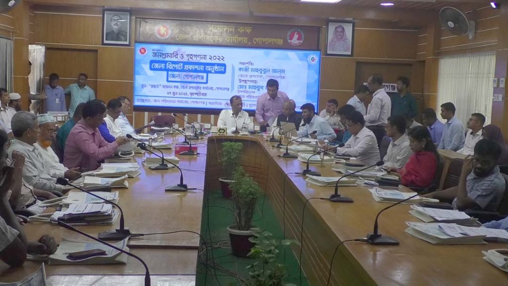 গোপালগঞ্জে প্রথম ডিজিটাল জনশুমারী ও গৃহগননা-২০২২ বিষয়ক জেলা রিপোর্ট প্রকাশনা অনুষ্ঠান অনুষ্ঠিত হয়েছে।বৃহস্পতিবার (২৭জুন) সকালে জেলা প্রশাসকের সম্মেলন কক্ষে অনুষ্ঠিত এই প্রকাশনা অনুষ্ঠানে সভাপতিত্ব করেন অতিরিক্ত জেলা প্রশাসক(সার্বিক)মোঃ গোলাম কবির। বিশেষ অতিথি হিসাবে উপস্থিত ছিলেন জেলা আওয়ামী লীগের সভাপতি মাহাবুব আলী খান। অনুষ্ঠানে পাওয়ার পয়েন্ট উপস্থাপন করেন জেলা পরিসংখ্যান অফিসের উপপরিচালক মাহবুব আলম।অনুষ্ঠানে জেলার স্বাস্থ্য, শিক্ষা, বেকারত্ব, উন্নয়ন সহ নানা বিষয়ের পরিসংখ্যান দেয়া হয়। আগামীতে বিভাগ ধরে ধরে জেলার উন্নয়নে সংশ্লিষ্ট বিভাগ গুলি কাজ করে জেলার উন্নয়ন এগিয়ে নেয়ার আহবান জানান বক্তারা।