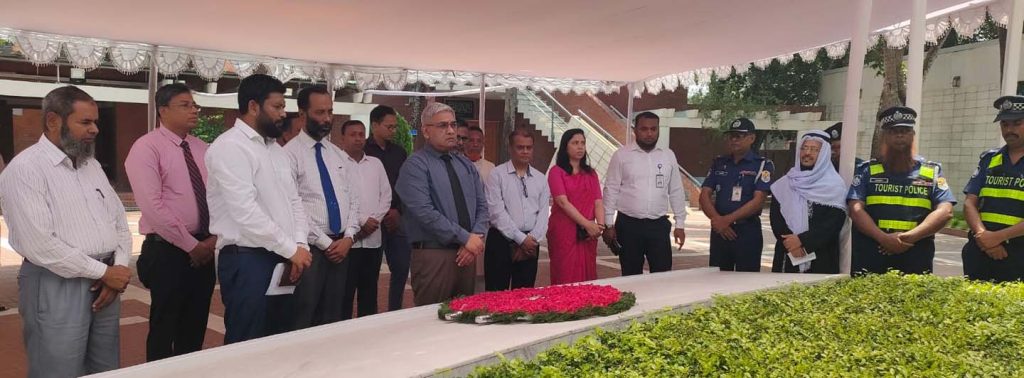 গোপালগঞ্জের টুঙ্গিপাড়ায় জাতির পিতা বঙ্গবন্ধু শেখ মুজিবুর রহমানের সমাধিতে শ্রদ্ধা জানিয়েছেন বাংলাদেশ লোক প্রশাসন প্রশিক্ষণ কেন্দ্রের রেক্টর (সরকারের সচিব)সাঈদ মাহবুব খান। তিনি শনিবার (১জুন) দুপুরে টুঙ্গিপাড়া পৌঁছে জাতির পিতা বঙ্গবন্ধু শেখ মুজিবুর রহমানের সমাধিসৌধ বেদীতে ফুল দিয়ে শ্রদ্ধা নিবেদন করেন।স্বাধীন বাংলাদেশের মহান স্থপতির স্মৃতির প্রতি বিন¤্র শ্রদ্ধা জ্ঞাপন করে তিনি বেদীর পাশে কিছুক্ষণ নীরবে দাড়িয়ে থাকেন।পরে পবিত্র ফাতেহাপাঠ করে তিনি জাতির পিতা বঙ্গবন্ধু শেখ মুজিবুর রহমান, ৭৫ এর ১৫ আগস্টের শহীদ ও মহান মুক্তিযুদ্ধে আত্মউৎসর্গকারী ৩০ লাখ শহীদের রুহের মাগফিরাত কামনায় বিশেষ দোয়া-মোনাজাতে অংশ নেন। প্রার্থনা করা হয় প্রধানমন্ত্রী শেখ হাসিনার সুস্বাস্থ্য সাফল্য ও দীর্ঘায়ূ কামনায়।শ্রদ্ধা নিবেদন শেষে বাংলাদেশ লোক প্রশাসন প্রশিক্ষণ কেন্দ্রের রেক্টর সাঈদ মাহবুব খান টুঙ্গিপাড়া বঙ্গবন্ধু সমাধিসৌধের প্রশাসনিক ভবনে যান। সেখানে বিশ্রামাগারে রক্ষিত পরিদর্শণ বইতে তিনি মন্তব্য লিখে স্বক্ষর করেন।এ সময় বাংলাদেশ লোক প্রশাসন প্রশিক্ষণ কেন্দ্র, গোপালগঞ্জ জেলা প্রশাসন ও টুঙ্গিপাড়া উপজেলা প্রশাসনের পদস্থ কর্মকর্তারা উপস্থিত ছিলেন।